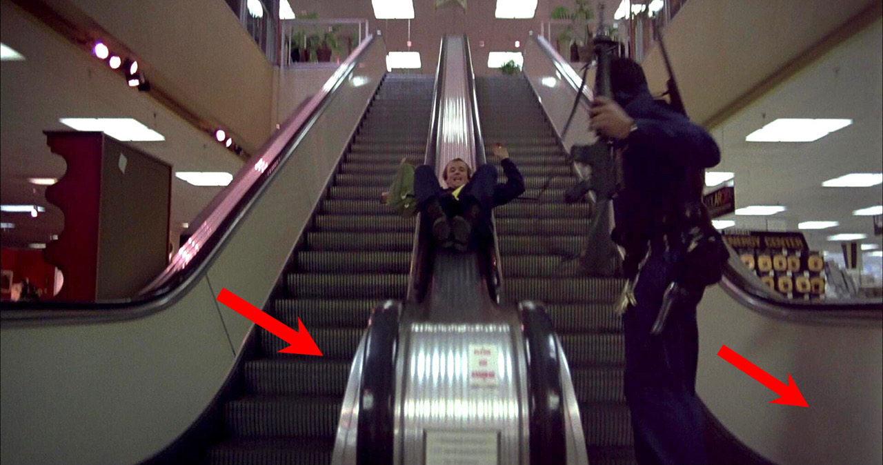 I tried to find this exact spot for a long time, it took a number of years, and a number of trips to figure it out. There are a few reasons why it was hard to figure out. The major reason was that the shot, as seen in the movie on DVD, and Blu-ray was never clear enough to see the patterns on the floor to get an exact match. I tried to find the exact spot on many trips to the mall, but I was always unsuccessful. There is another reason that it was hard to find the exact spot, but that’s a story for another day. Here’s a picture of the scene from the Anchor Bay Blu-ray.
